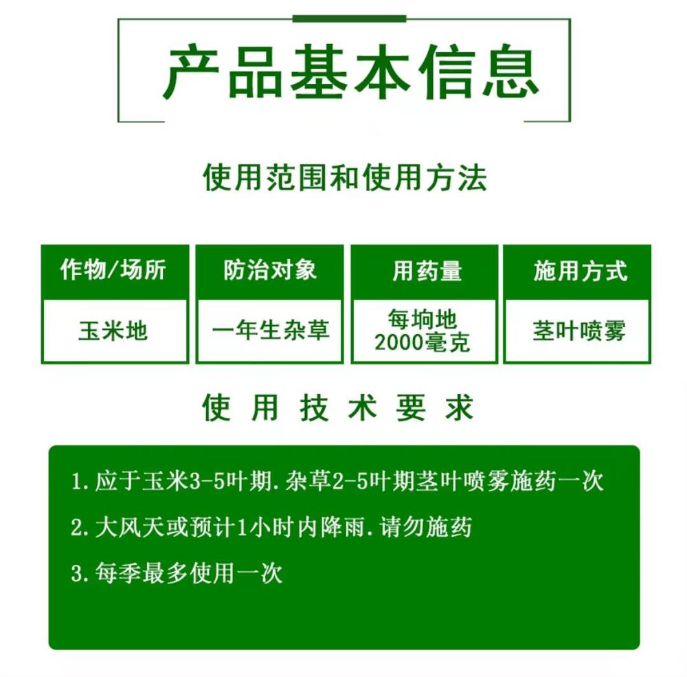 用途用量:玉米苗后除草,在杂草三叶前喷施,一桶一垧地,根据草量草情,酌情调整用量